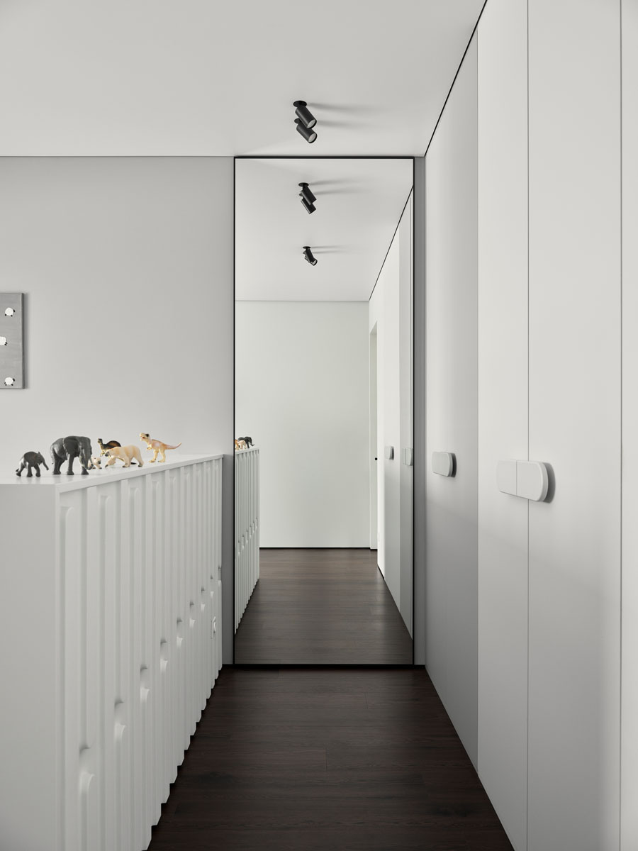 За внешним минимализмом и аккуратными стыками скрывается современная начинка: элементы умного дома, электрокарнизы, тёплый пол.