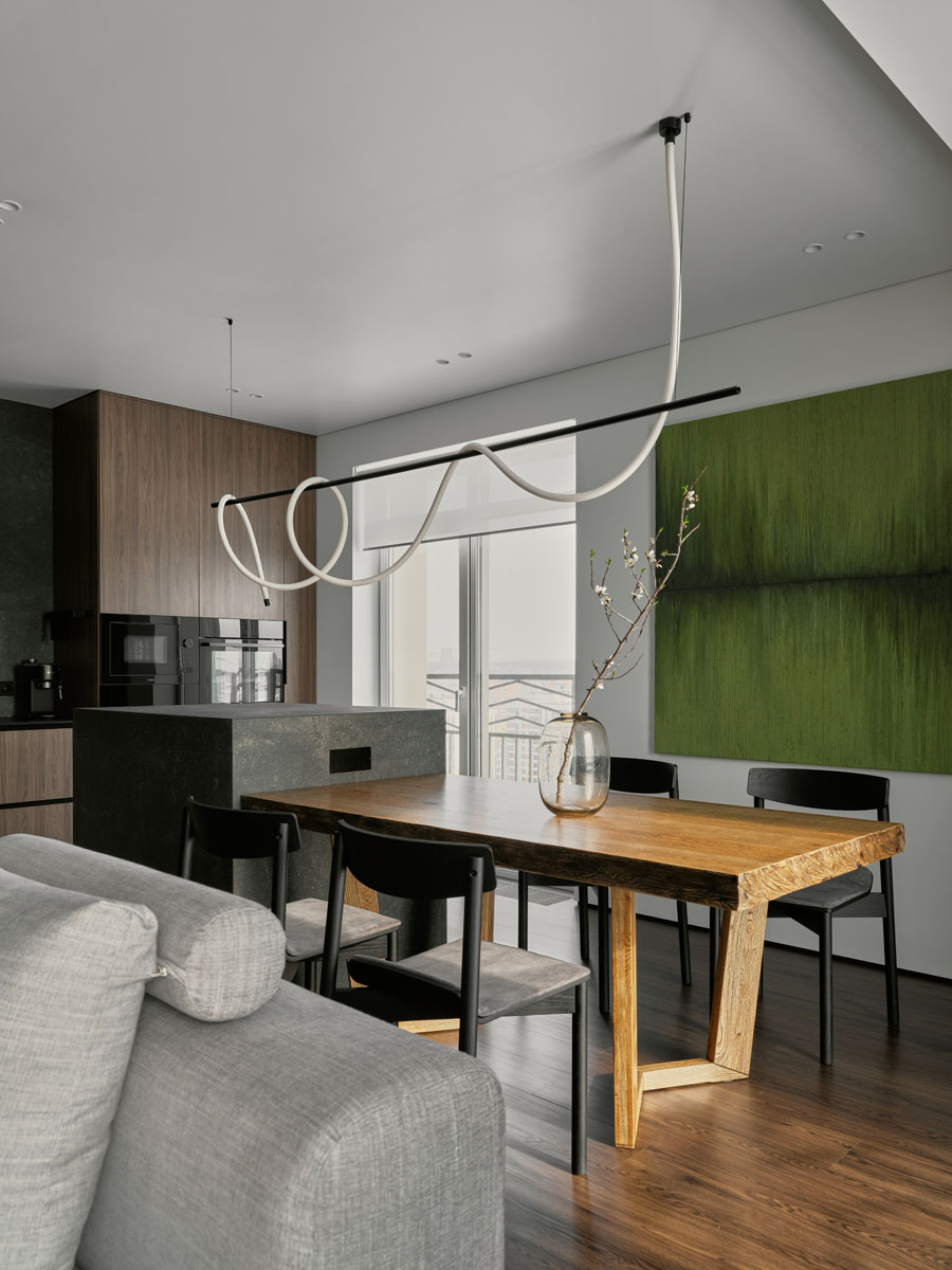Для квартиры 97 м² с панорамным видом на Обь создали стильный и удобный интерьер по четкому запросу заказчика. В отделке объединили темное дерево, фактуру камня и природный зеленый цвет, на пол уложили практичный кварцевый ламинат Fargo.